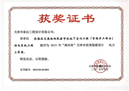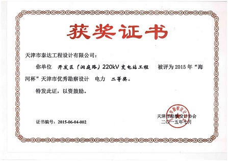 在電力設計分公司及相關部室的精心準備和不懈努力下,由我公司設計完成的“開發(fā)區(qū)(洞庭路)220kV變電站工程”和“濱海站交通樞紐配套市政地下空間工程(首期開工部分)供電系統(tǒng)工程”,分別榮獲天津市勘察設計協(xié)會2015年“海河杯”優(yōu)秀勘察設計電力二等獎和三等獎;此外,公司重點項目“千米橋220kV變電站工程”榮獲國家電網(wǎng)公司2015年度輸變電工程優(yōu)秀設計二等獎。